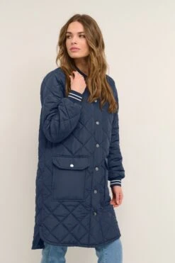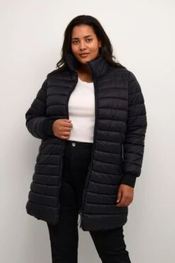 EffenGewatteerde jasGeribd ceintuurtjeStaande kraagZakken aan de zijkantOp staal nadenGladde stofLicht gevoerdRitssluiting
