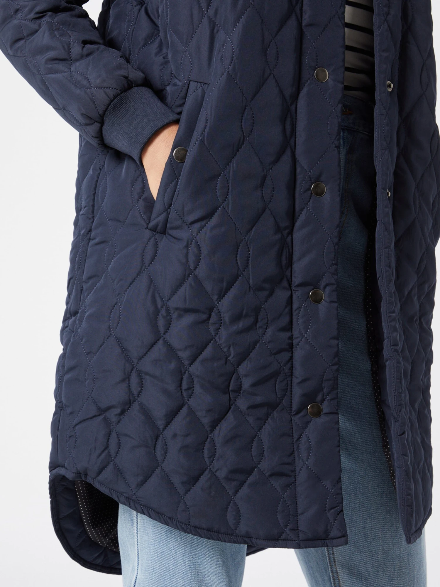 EffenGewatteerde jasGewatteerde jasDrukknopenGeribd ceintuurtjeRonde zoomVerlengd rugpandZakken aan de zijkantStikselsOp staal nadenLicht gevoerdDrukknoop